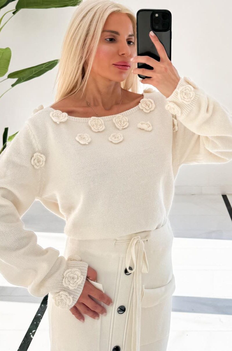 Μπλούζα πλεκτή εκρού με λουλουδάκια