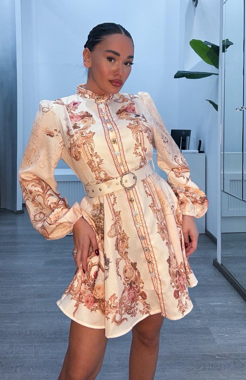 Φόρεμα μπεζ με στρας ζωνάκι και μεσοφόρι