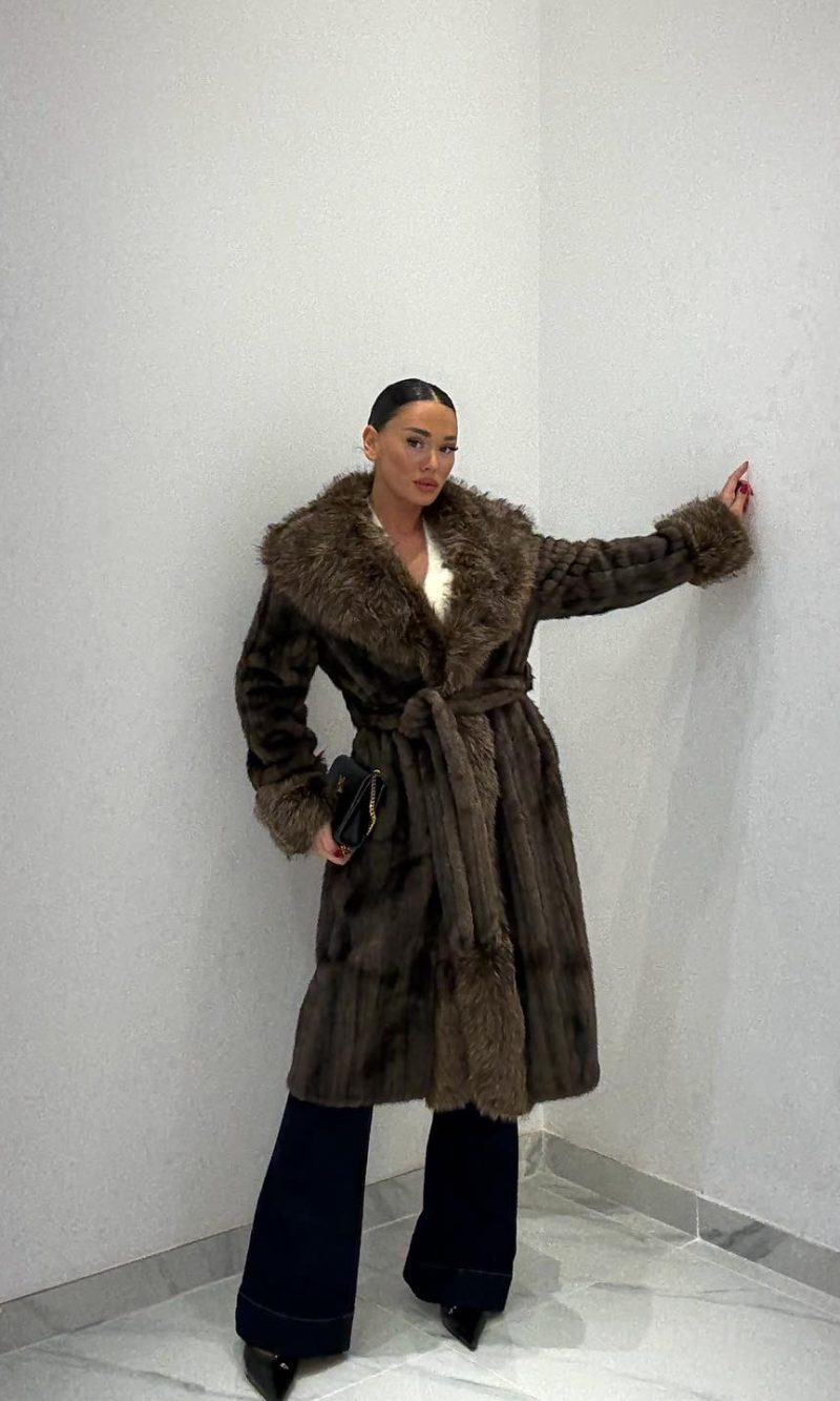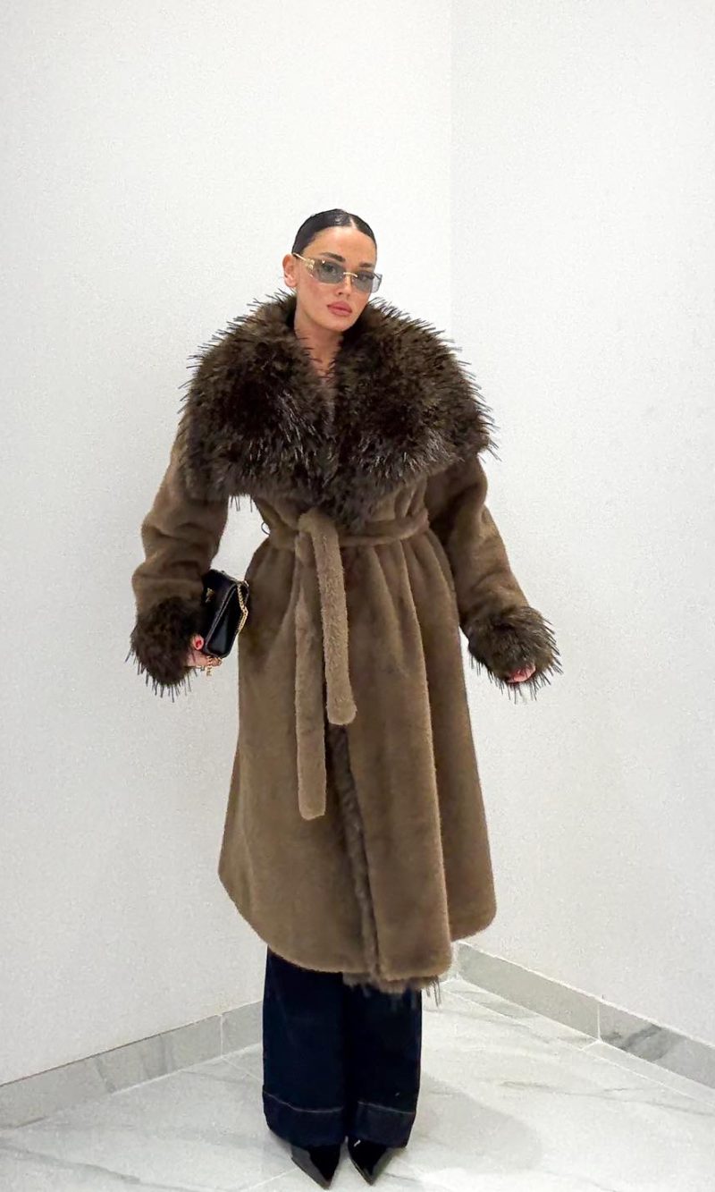 Γούνα οικολογική καφέ με πλούσιο γιακά και ζώνη