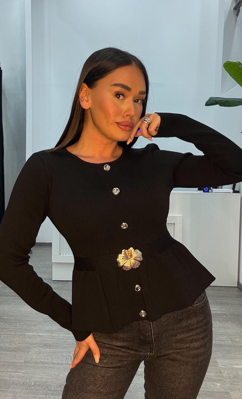 Πλεκτή Μπλούζα μαύρη με κουμπιά από στρας και δαντέλα στα μανίκια