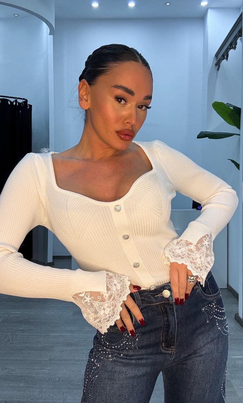 Πλεκτή Μπλούζα λευκή με κουμπιά από στρας και δαντέλα στα μανίκια