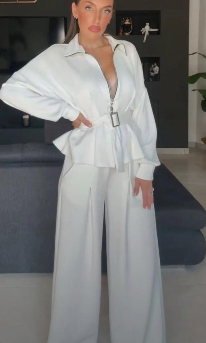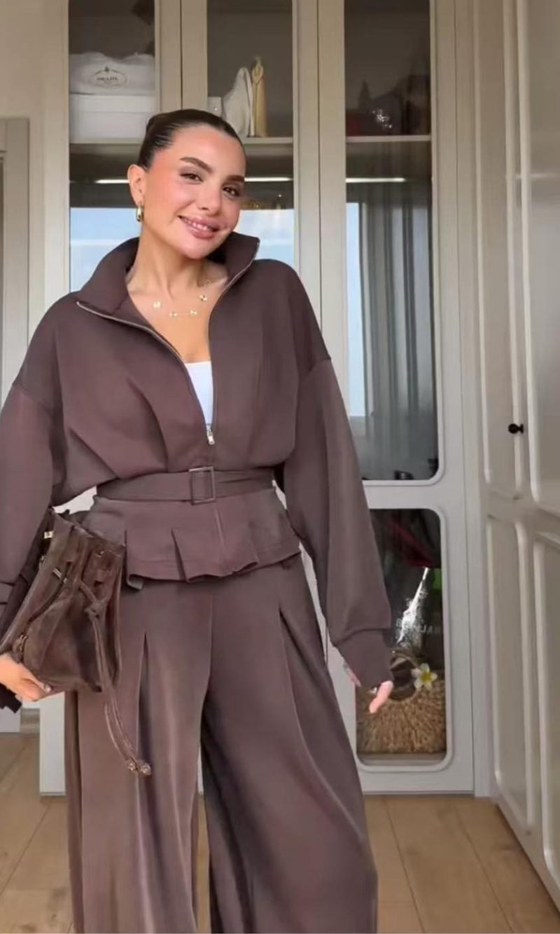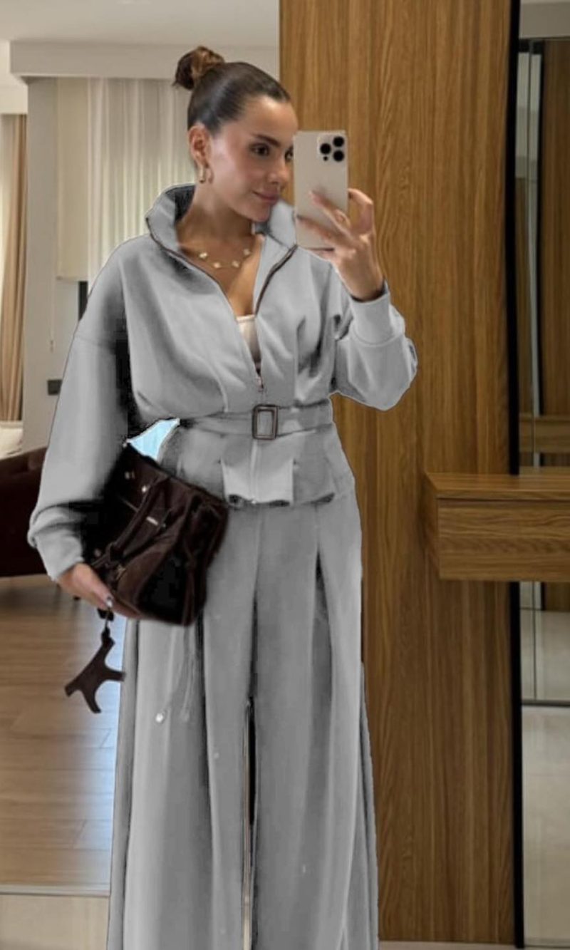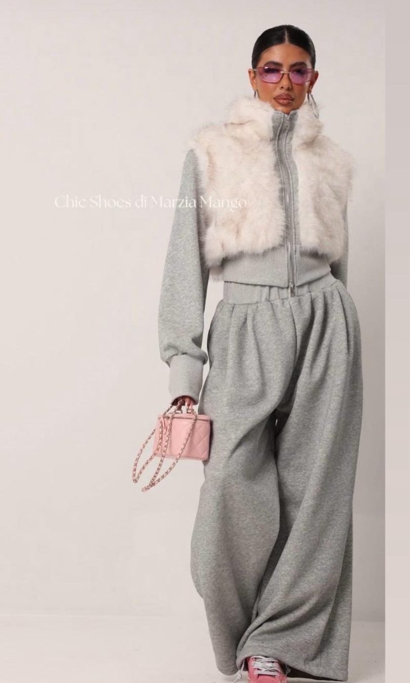 Σετ γκρι ζακέτα με γούνα και παντελόνι