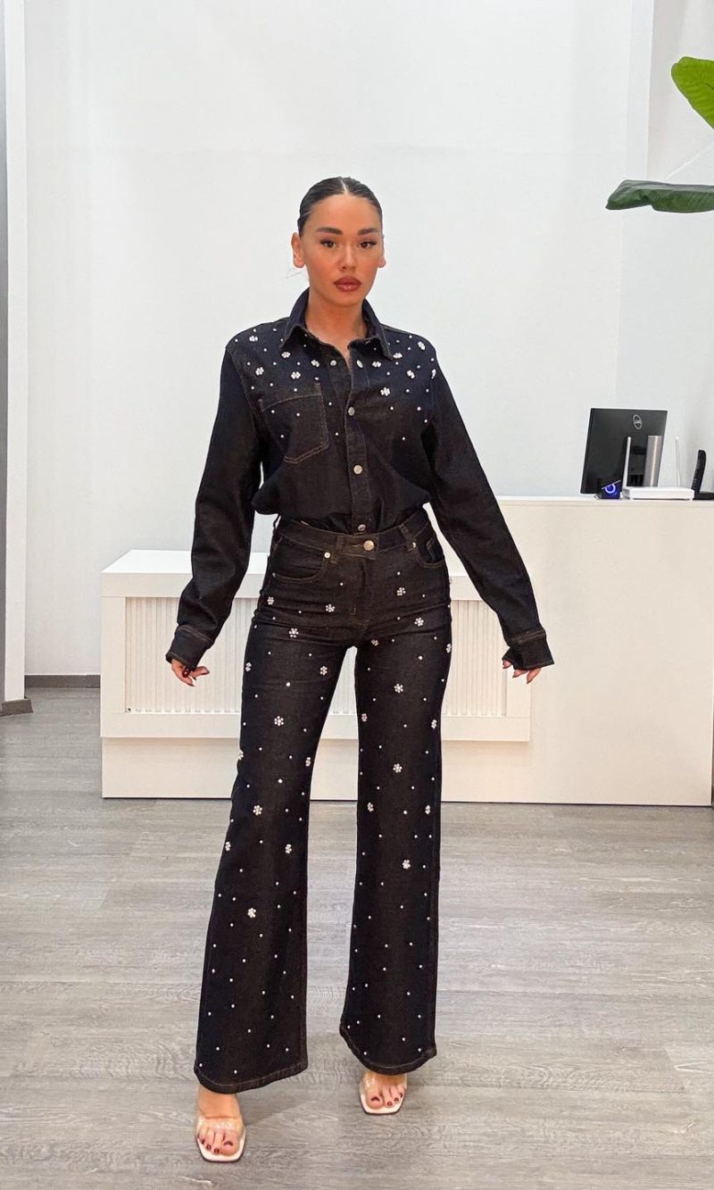 Σετ πουκάμισο παντελόνι σκούρο μπλε τζιν με πέρλες