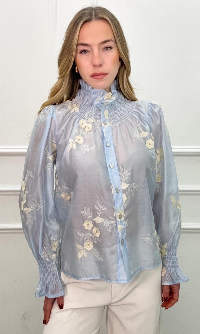 Πουκάμισο σιέλ με κεντημένα λουλούδια