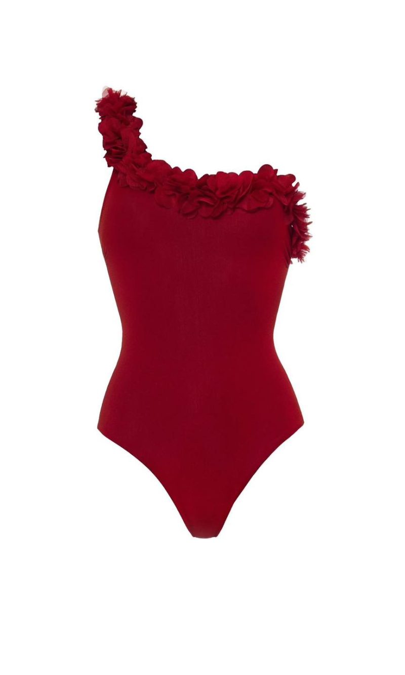 Μαγιό κόκκινο με λουλούδια και έναν ώμο