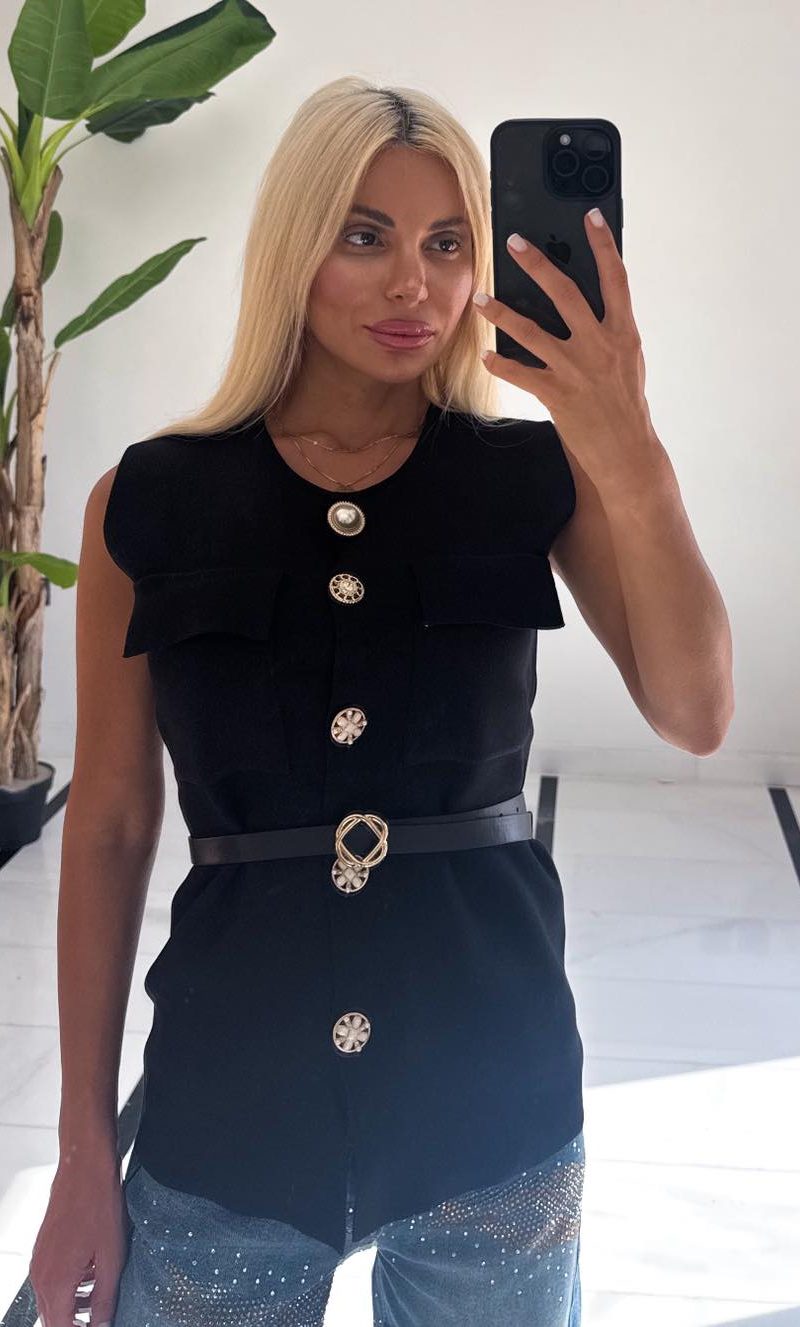 Πλεκτή Μπλούζα μαύρη με κουμπιά από στρας και δαντέλα στα μανίκια