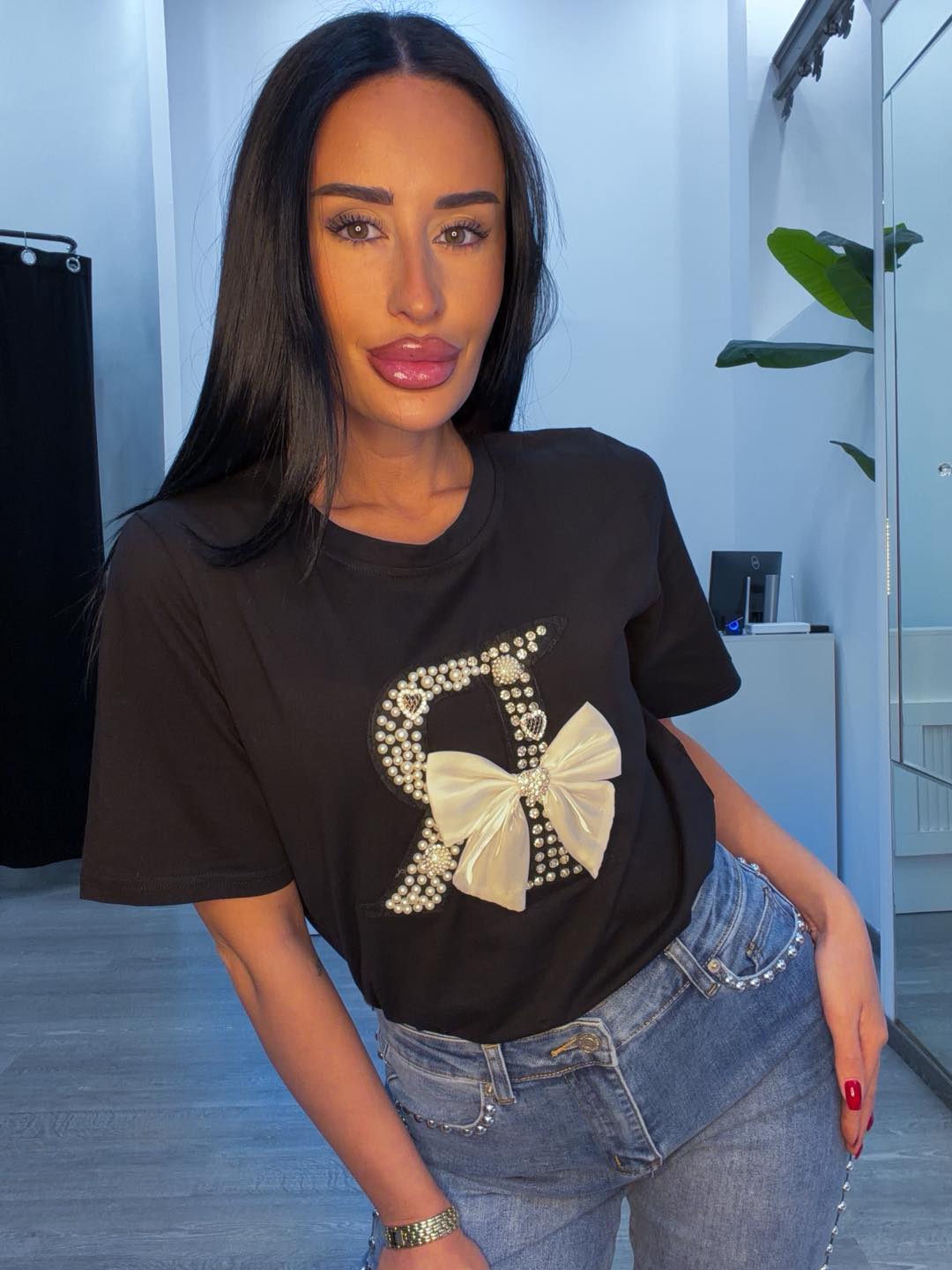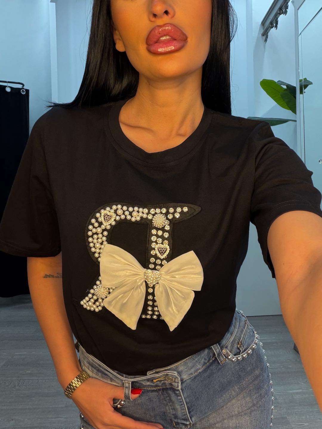 Μπλουζάκι μαύρο με πέρλες και φιόγκο