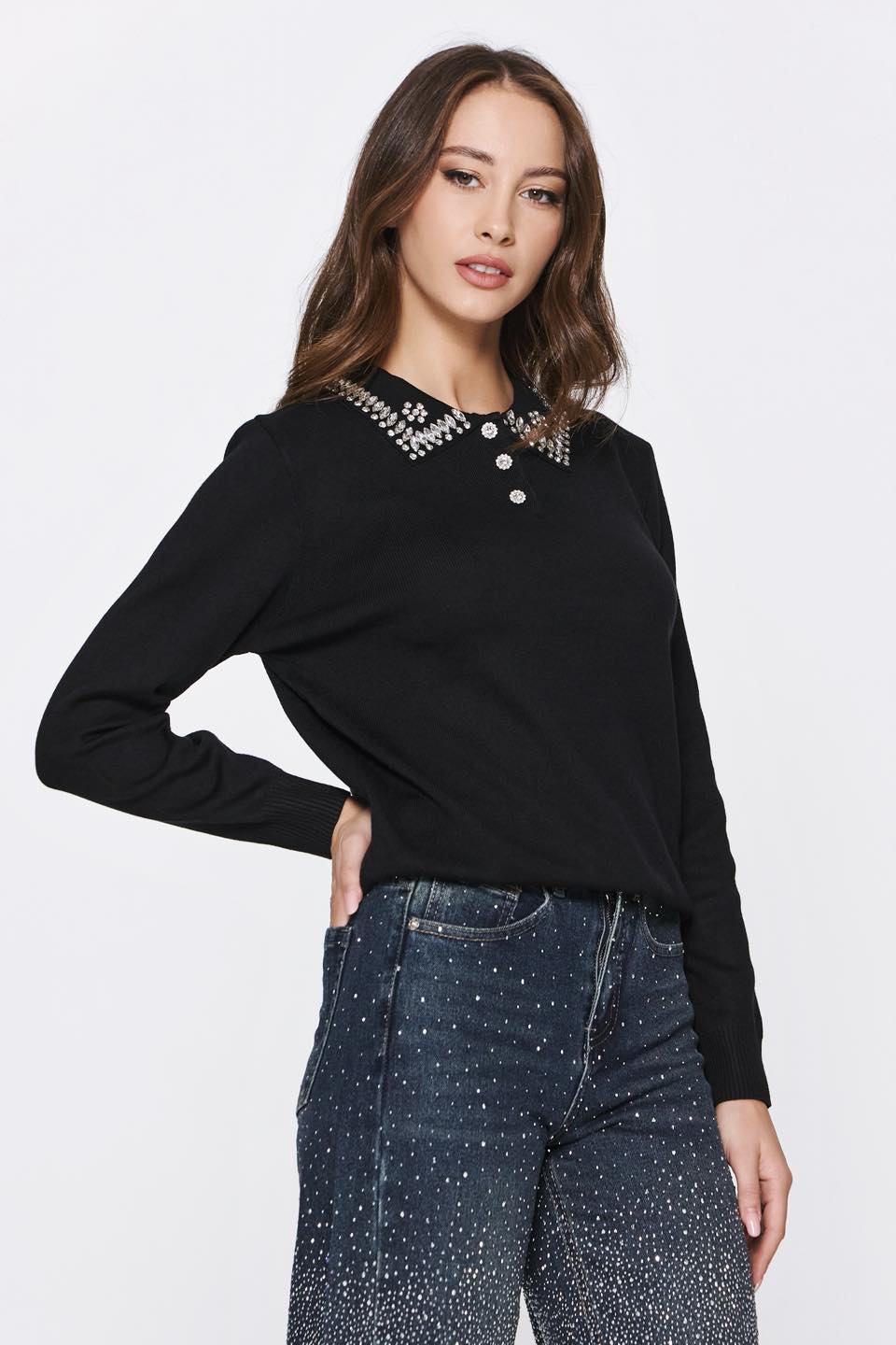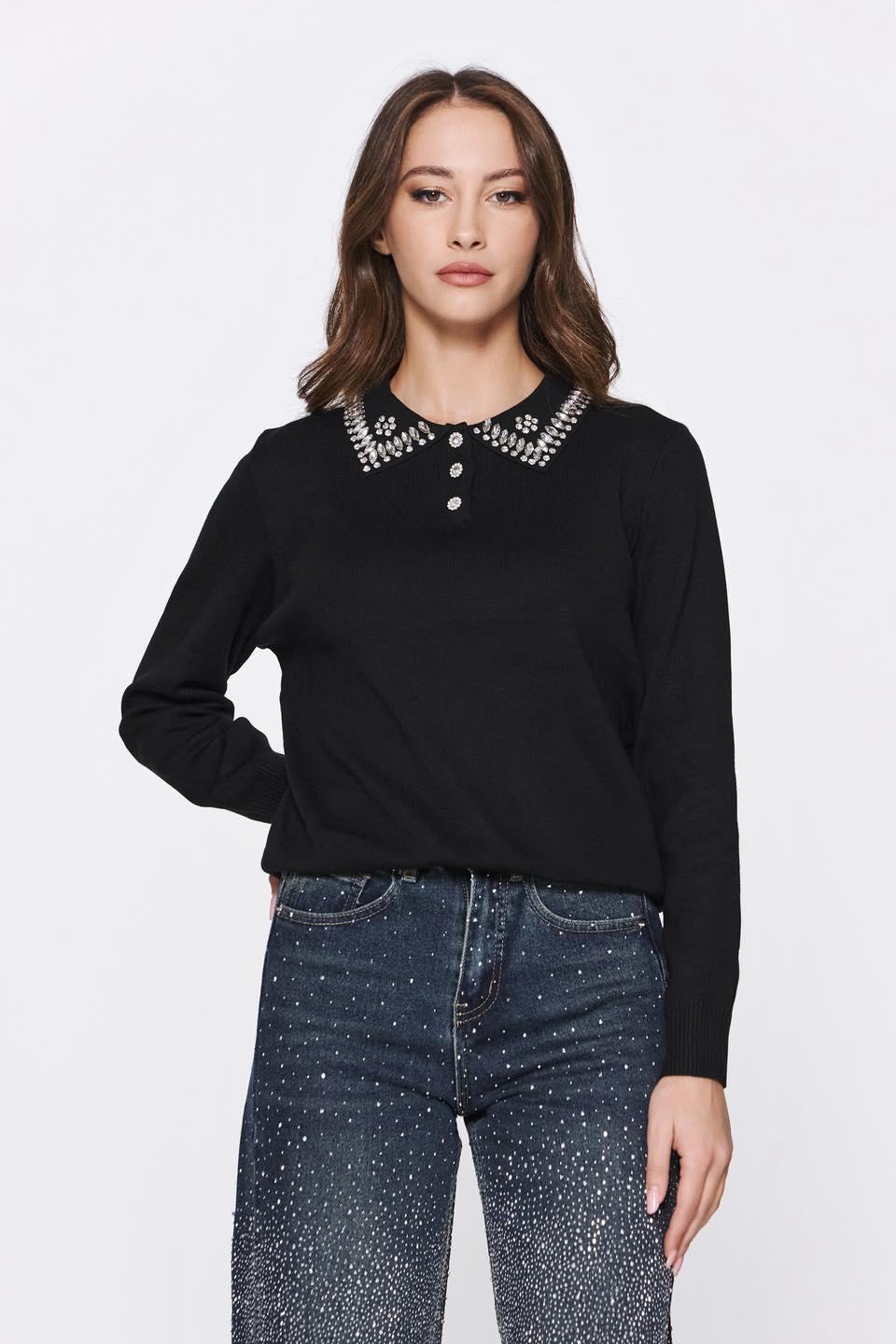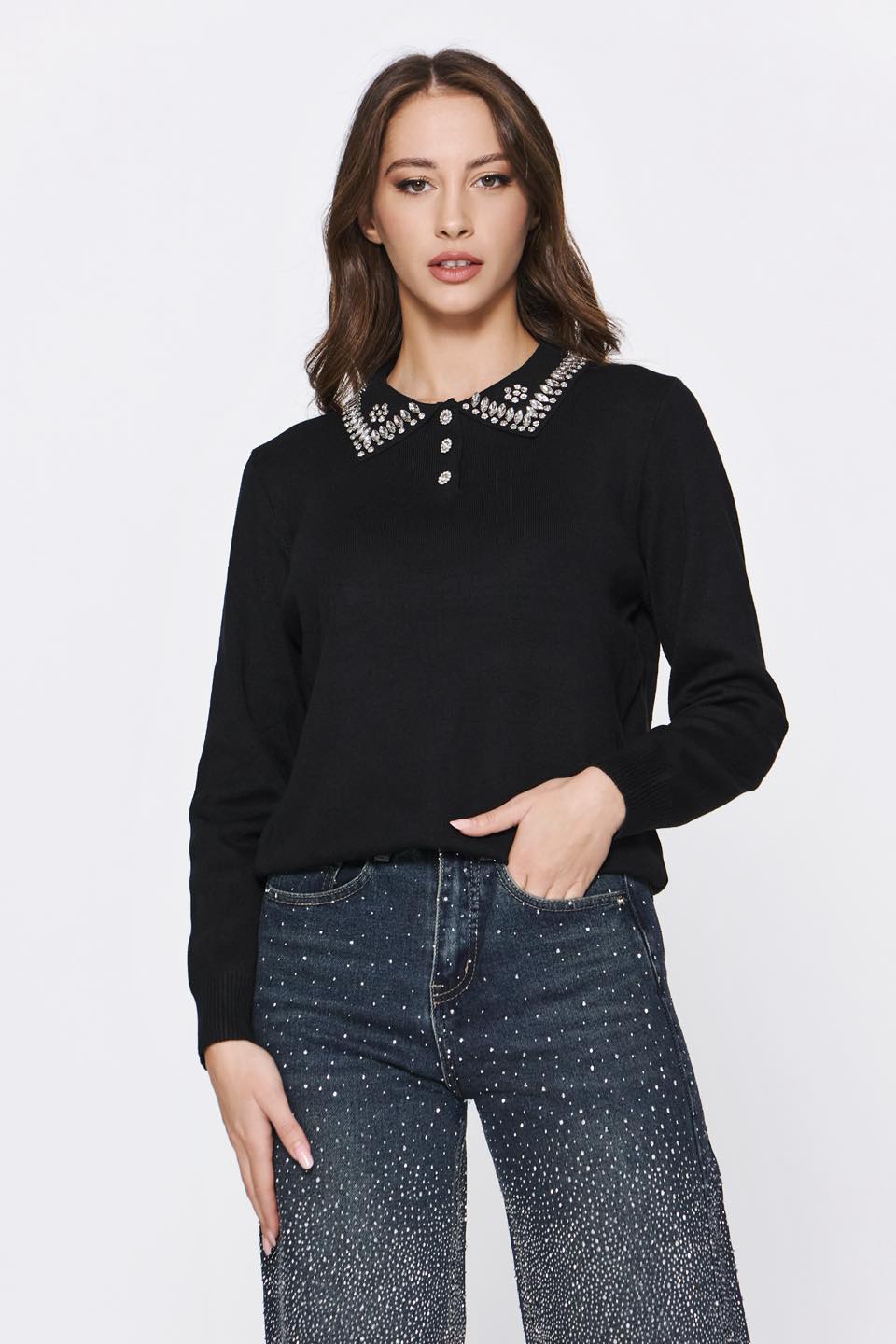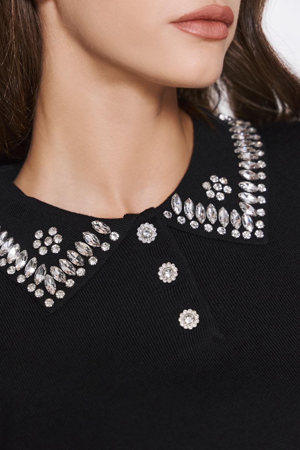 Μπλουζάκι πλεκτό μαύρο με γιακά και στρας