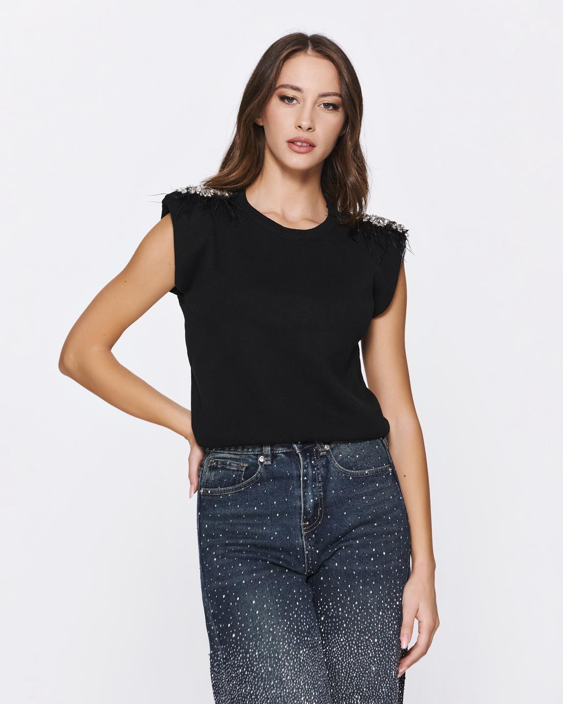 Πλεκτή μπλούζα μαύρη με στρας και φτερά μαραμπου