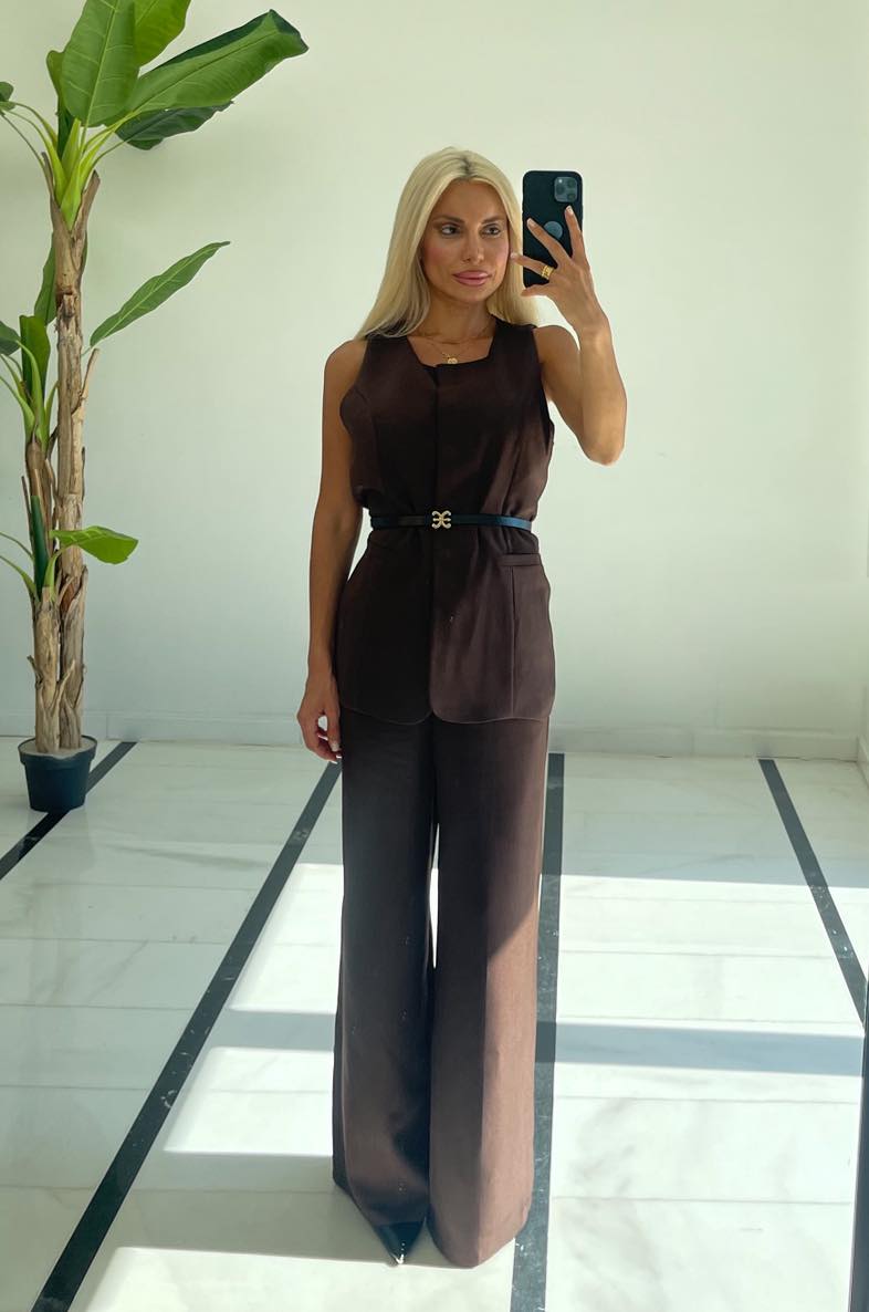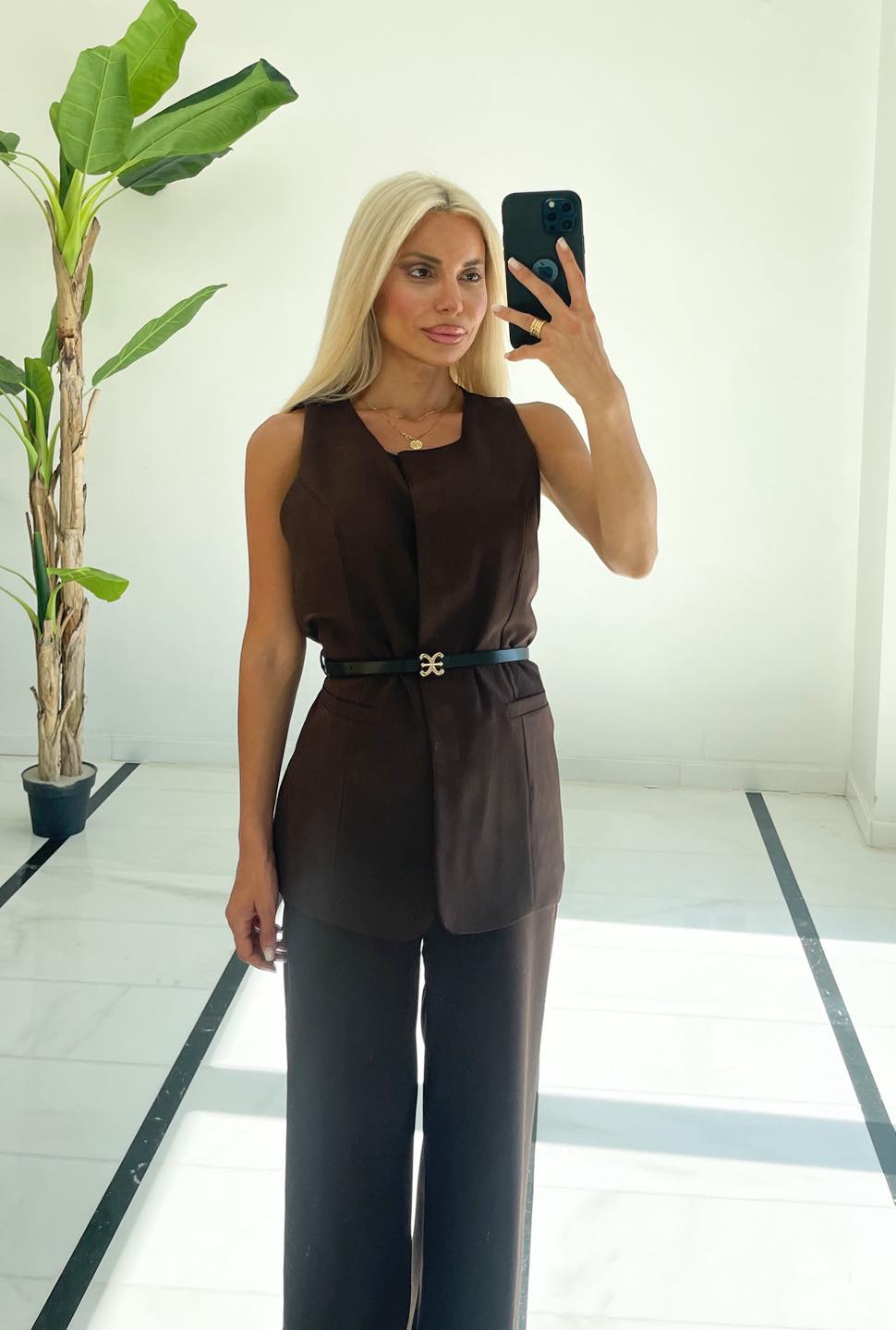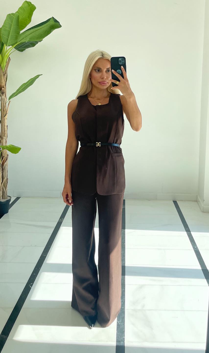 Σετ καφέ τριών τεμαχίων , γιλέκο ζώνη και παντελόνι με λάστιχο στη πίσω μέρος