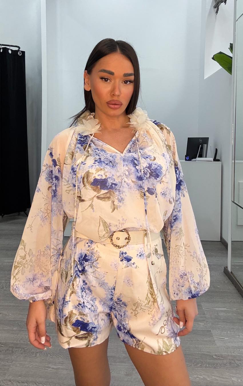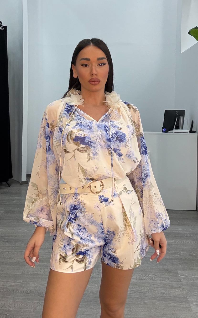 Σετ με πριντ τούλινη μπλούζα με μεσοφόρι και σορτσάκι