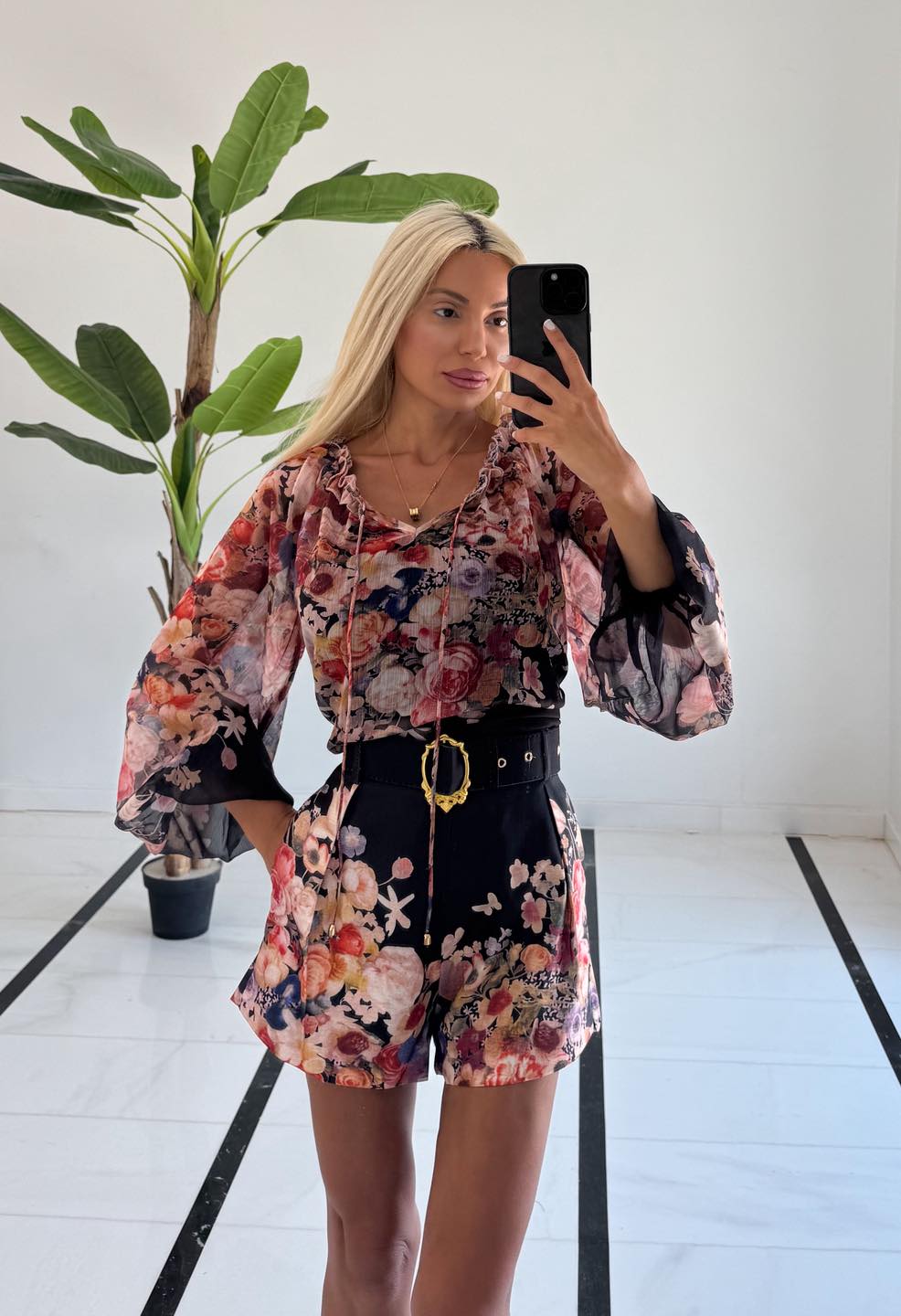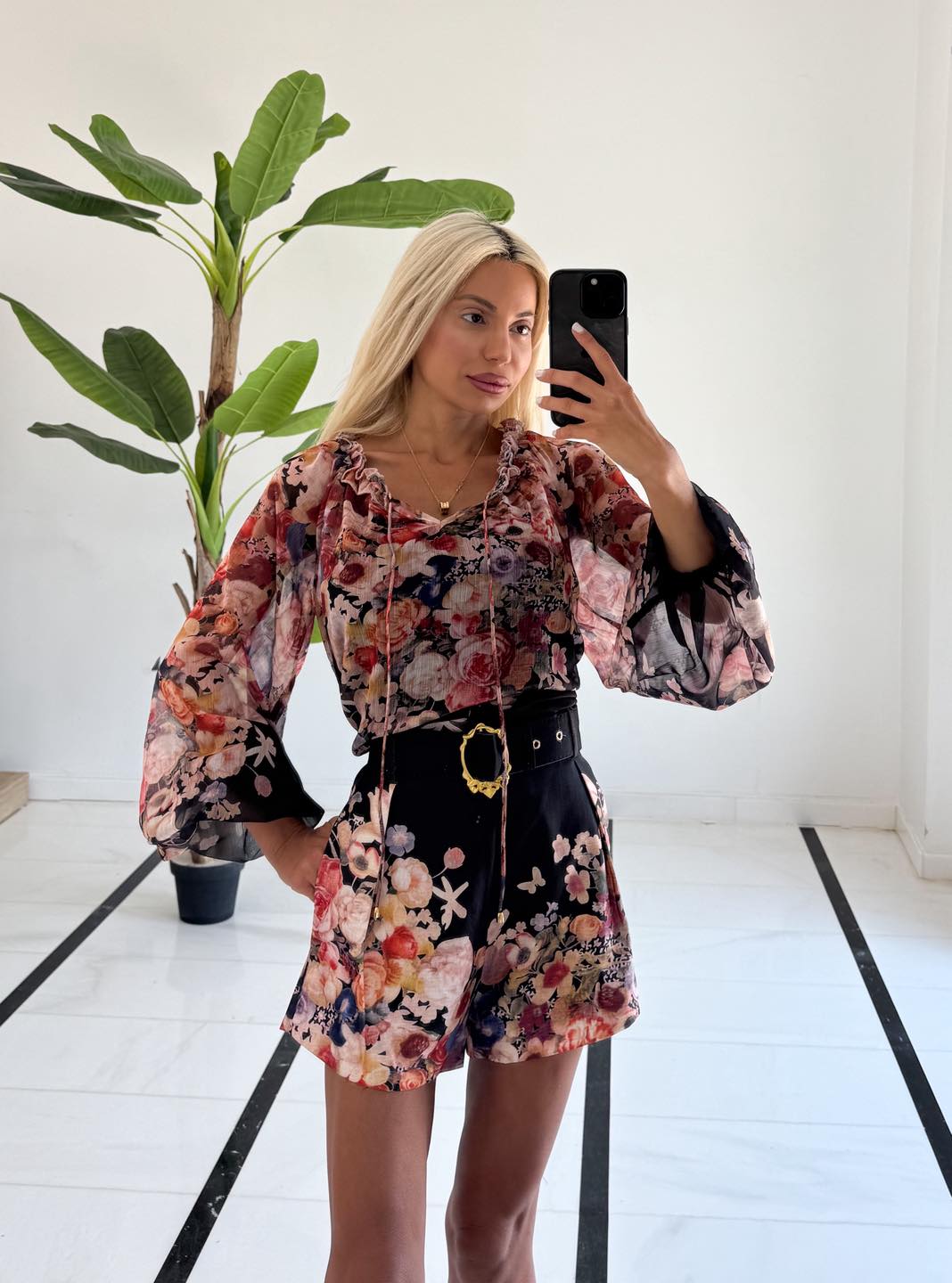 Σετ με πριντ τούλινη μπλούζα με μεσοφόρι και σορτσάκι