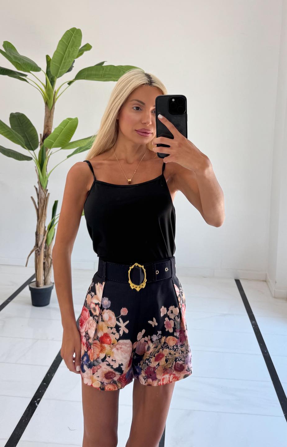 Σετ μαύρο 4 τεμαχίων σορτσάκι με ζώνη τούλινη μπλούζα και μεσοφόρι