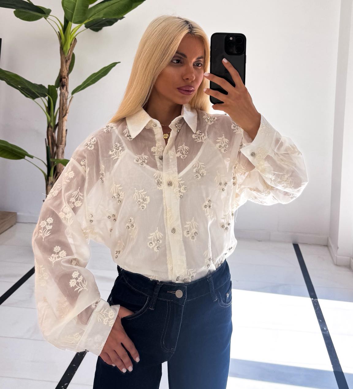 Τούλινο λευκό πουκάμισο με κεντημένα λουλούδια και στρας