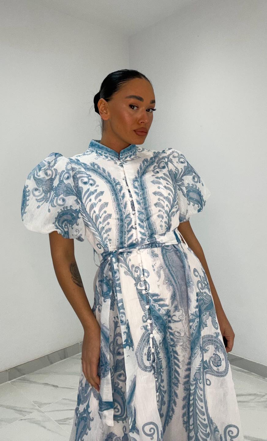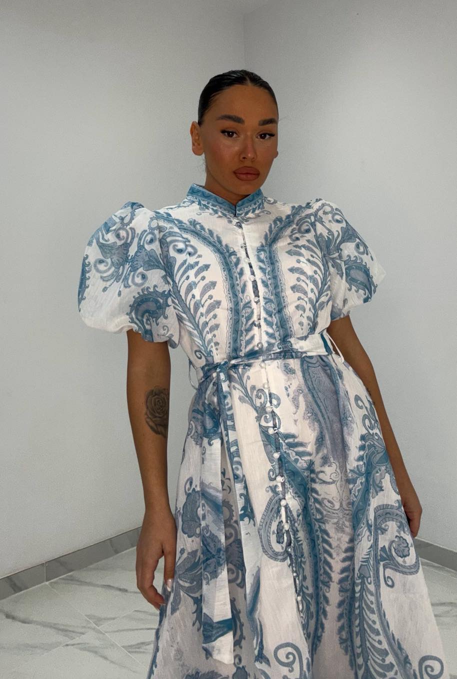 Φόρεμα λευκό με πριντ πετρόλ