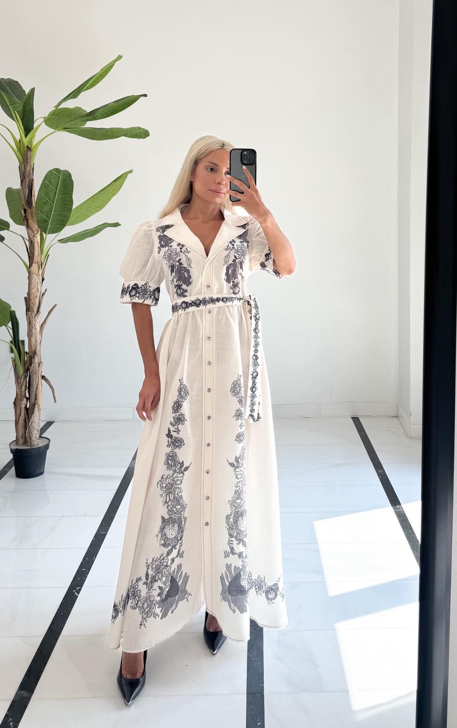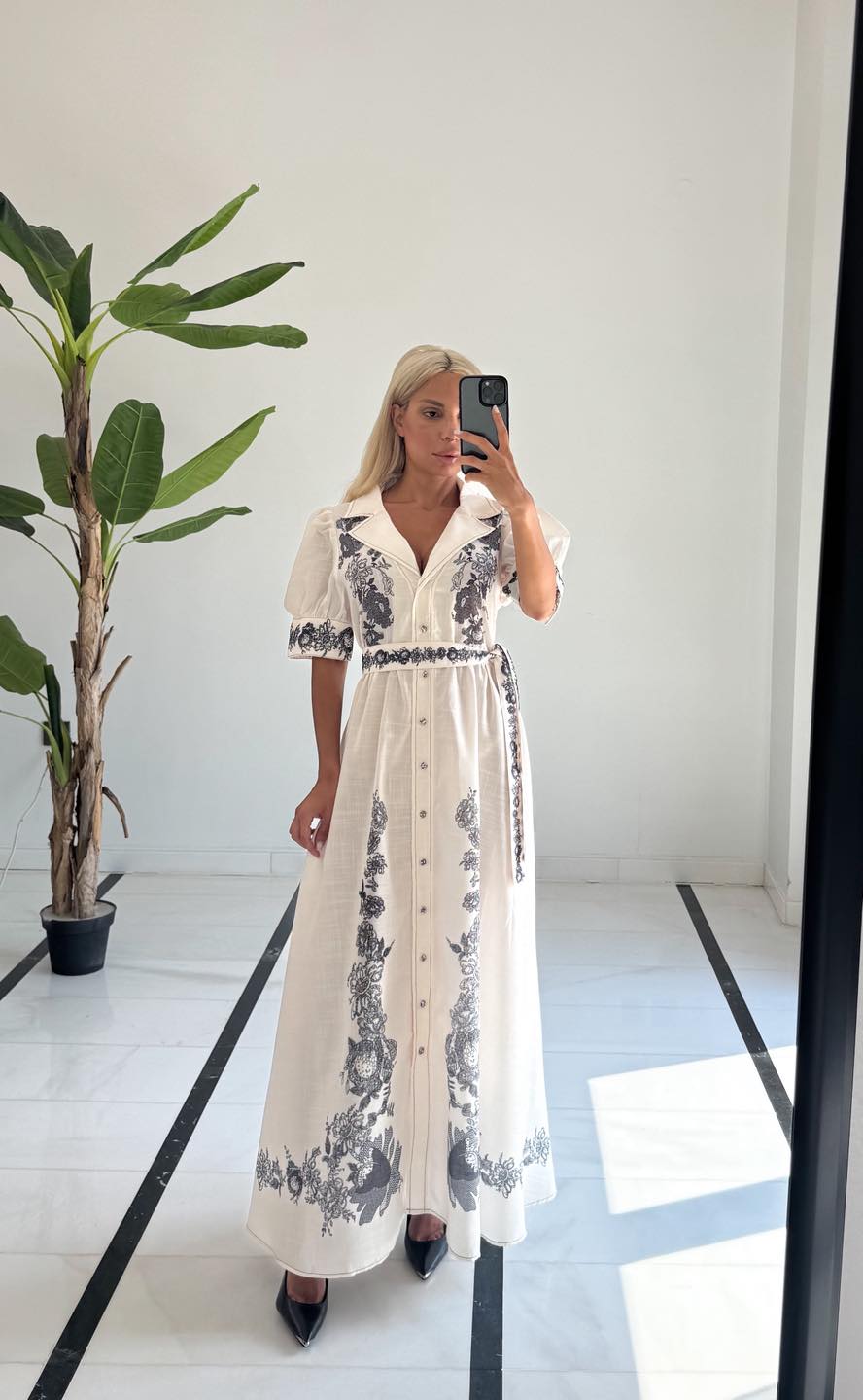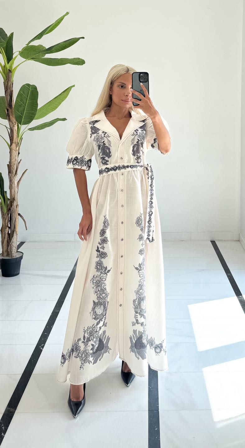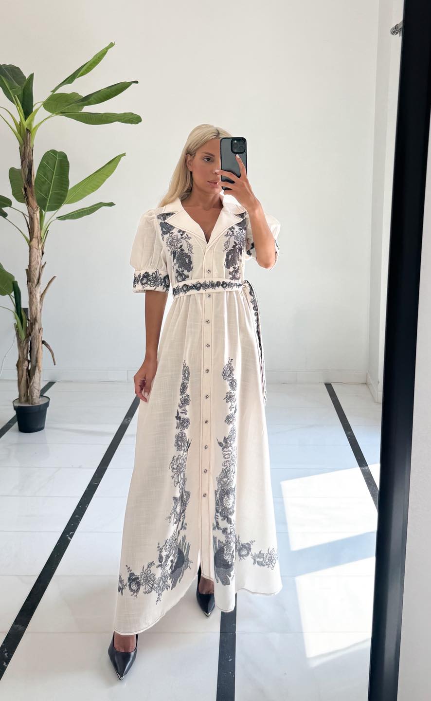 Φόρεμα λευκό με δαντέλα και κεντημένη με πολύ μικρή διακριτική παγιέτα