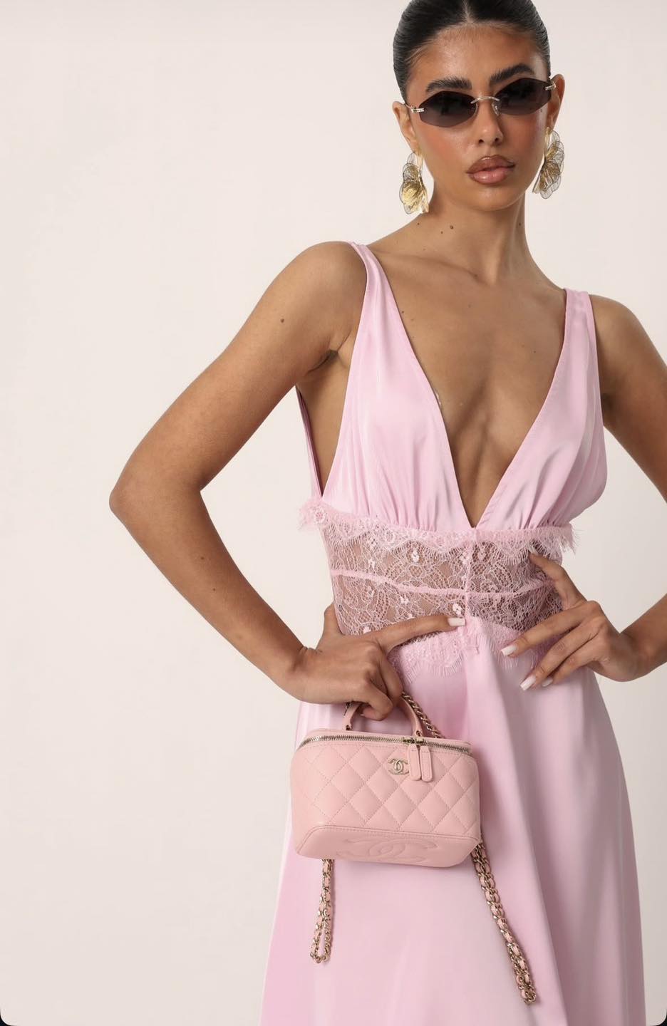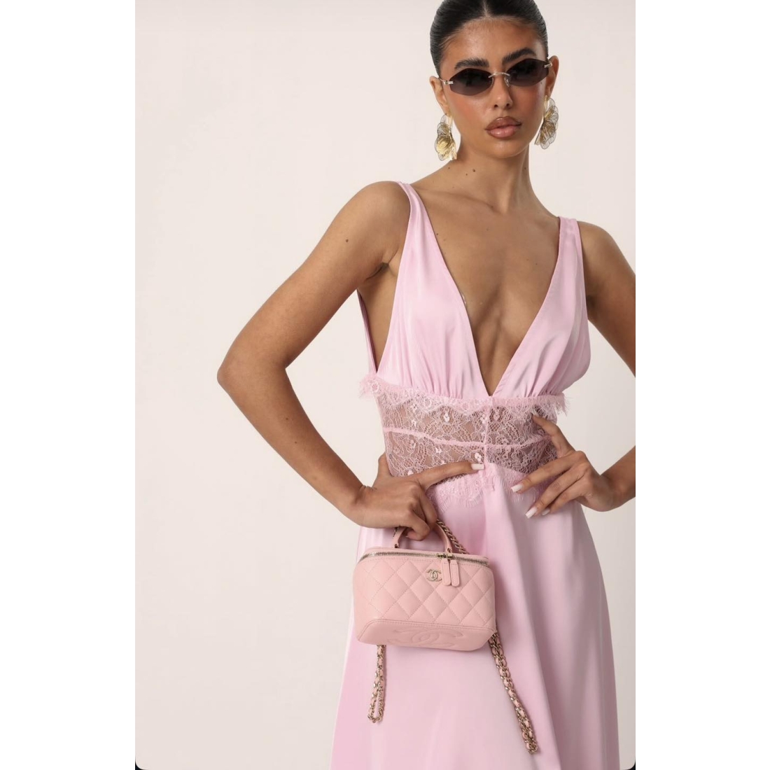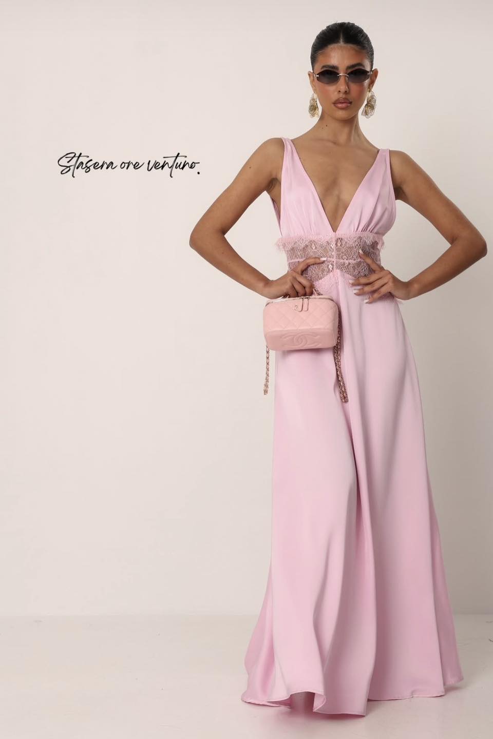 Φόρεμα μακρύ ροζ με δαντέλα στην μέση