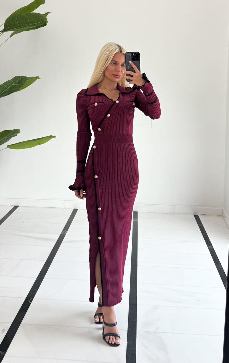 Φόρεμα πλεκτό με διάταξη και κουμπιά σε χρώμα μπορντό