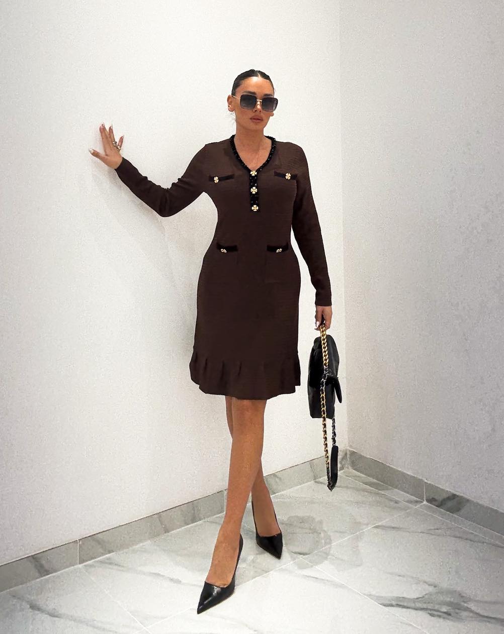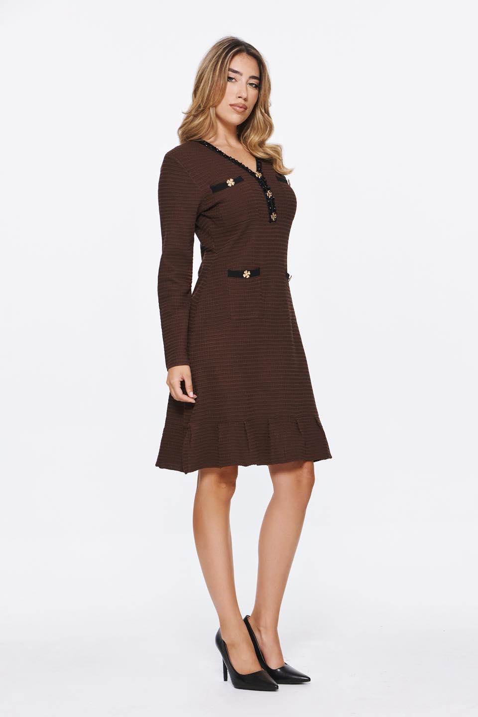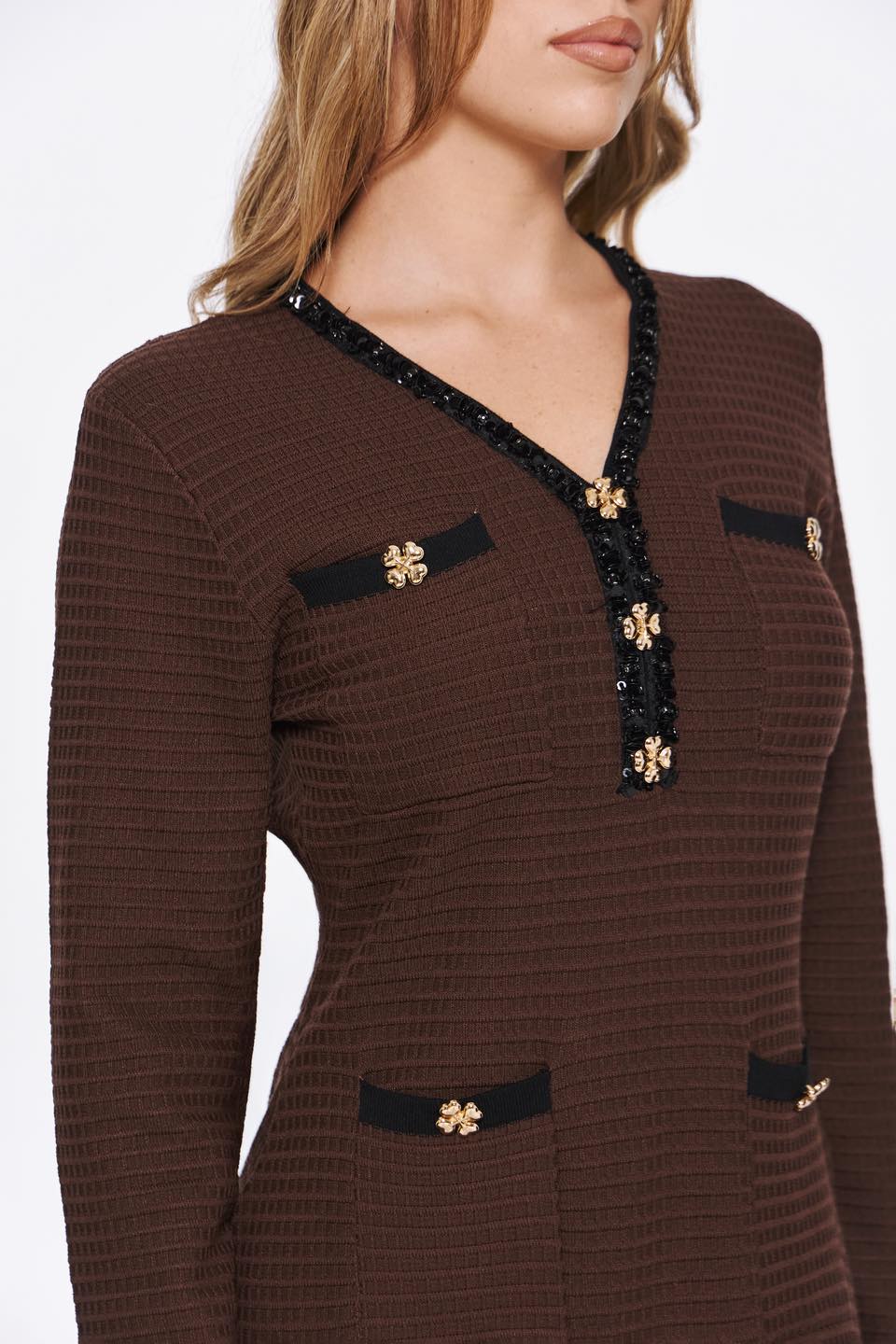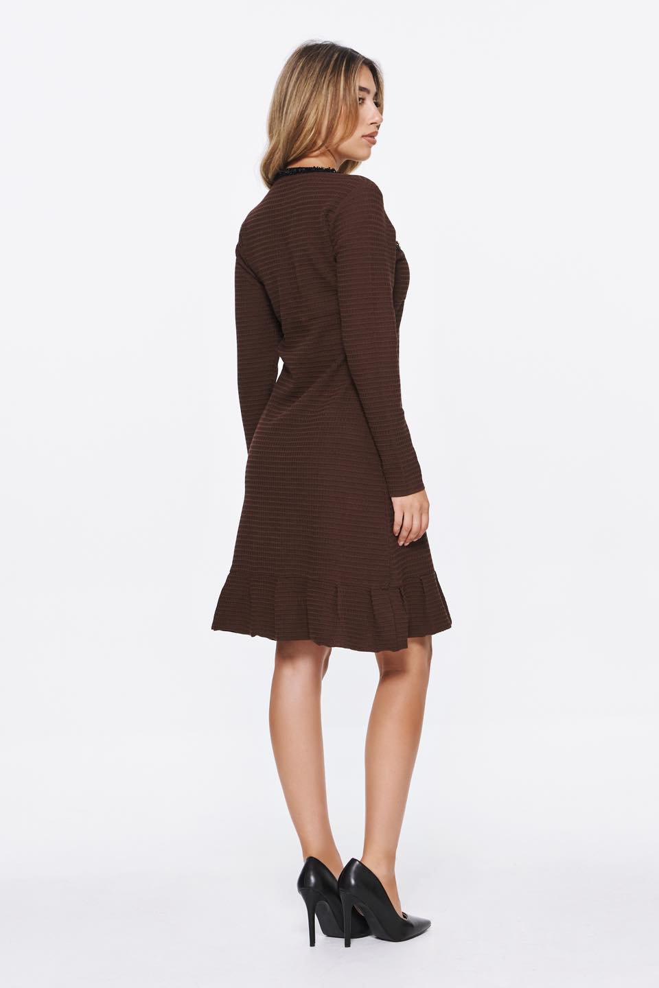 Φόρεμα πλεκτό καφέ με στρας και χρυσά κουμπιά