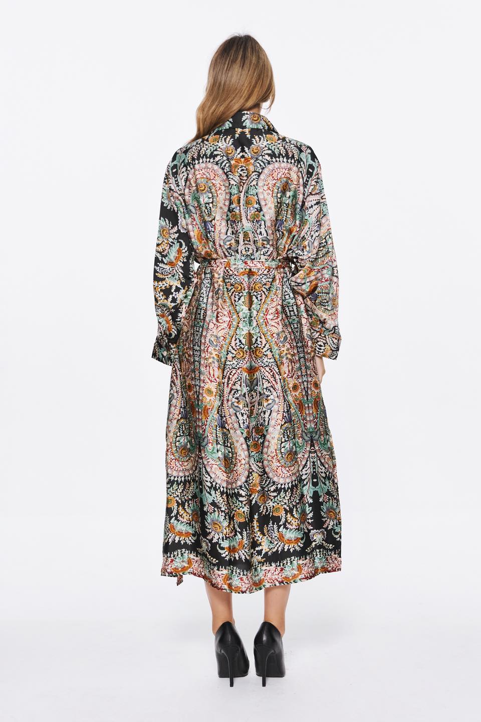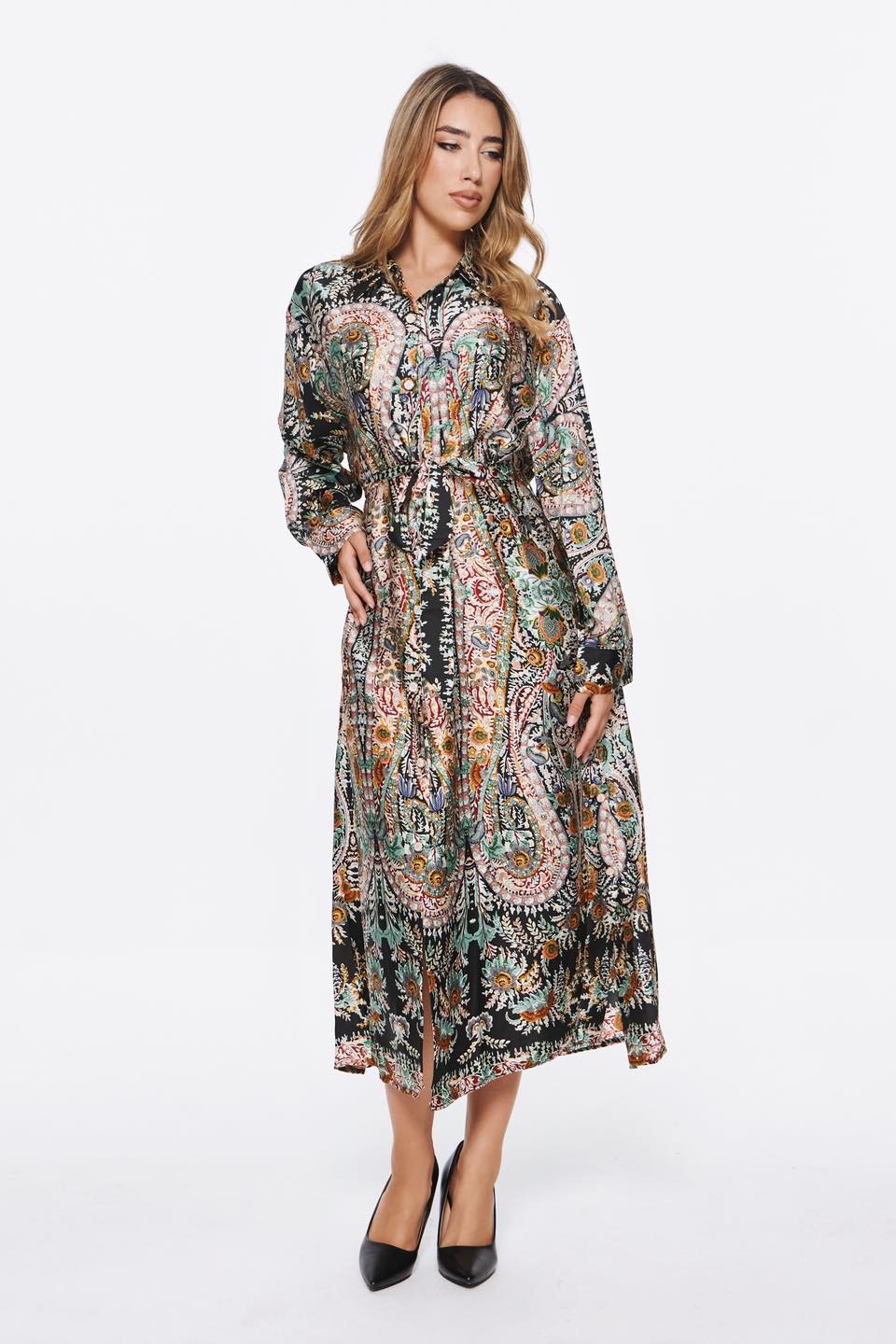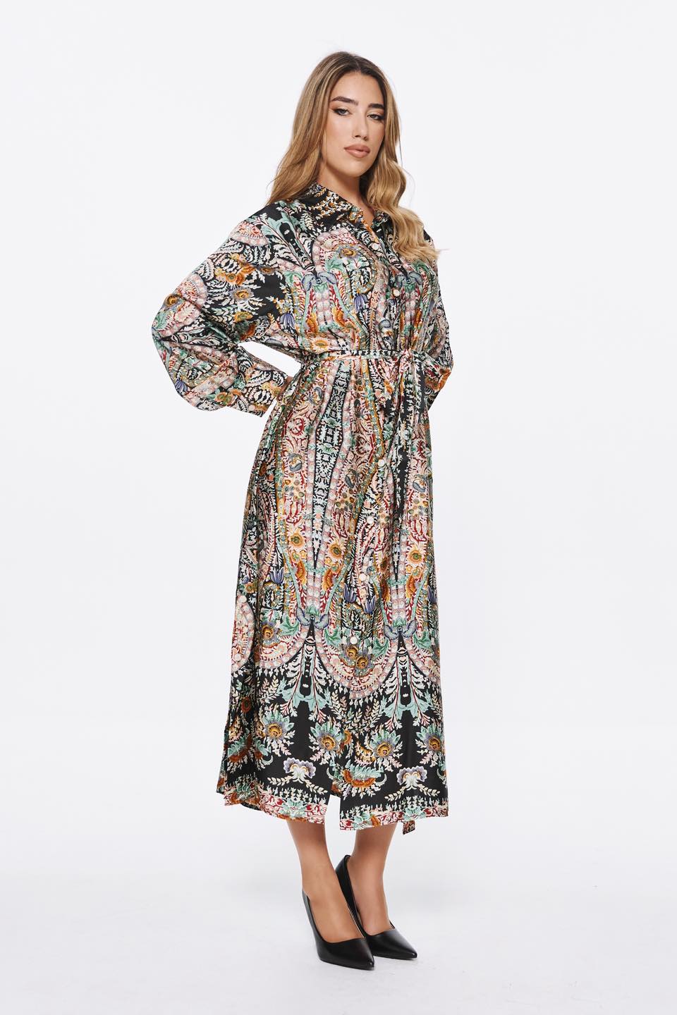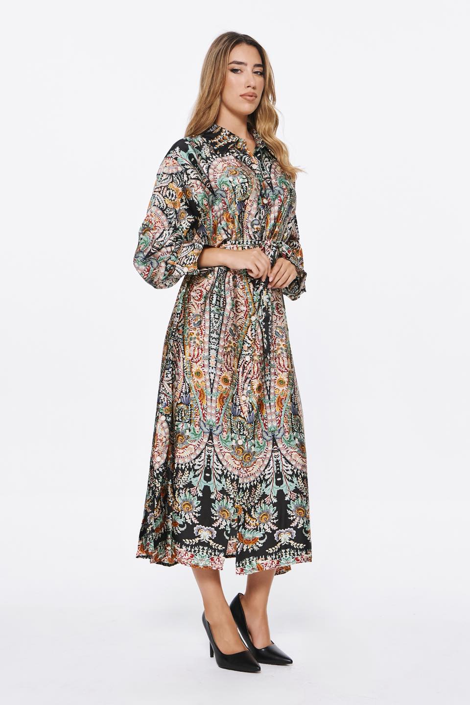 Φόρεμα σατέν με ζώνη και λευκά κουμπιά