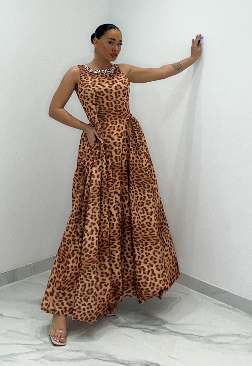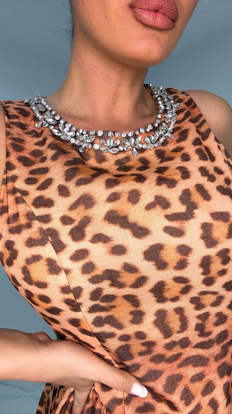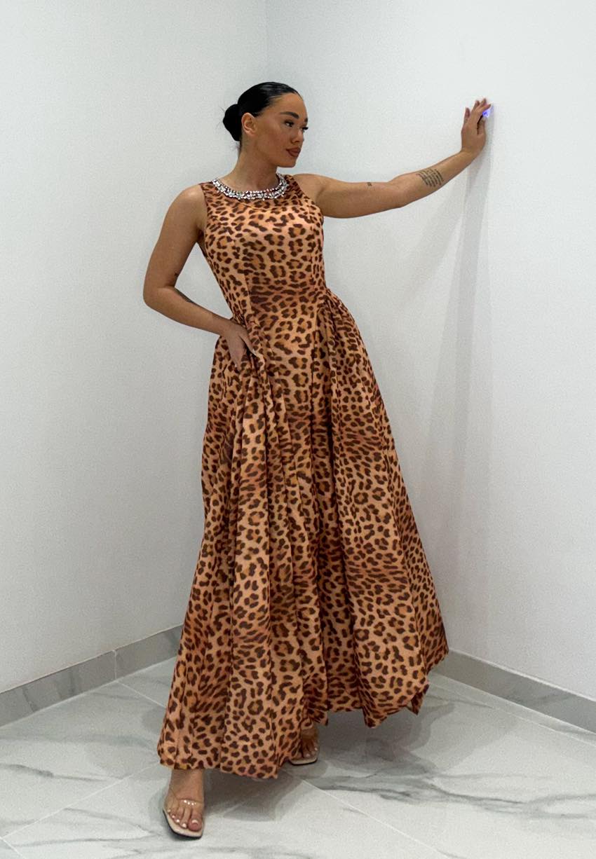 Φόρεμα καφέ μακρύ με ασημί σχέδια