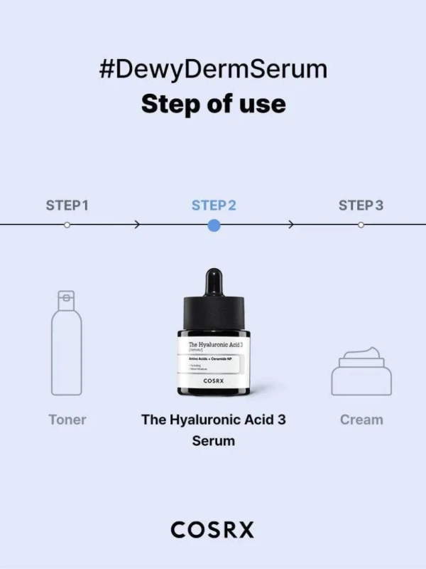 Το COSRX The Hyaluronic acid 3 είναι ένας ορός με 3% υαλουρονικό οξύ που ενυδατώνει, γεμίζει, καταπραΰνει και υποστηρίζει τον φραγμό υγρασίας της επιδερμίδας.